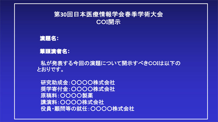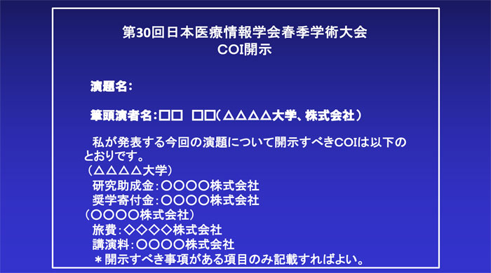 本医療情報学会春季学術大会や医療情報学連合大会において発表を行う場合には、発表者に対して利益相反の状況を開示することを義務づけ、演題の募集要項等に次のような内容を掲載する。
